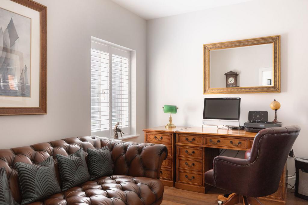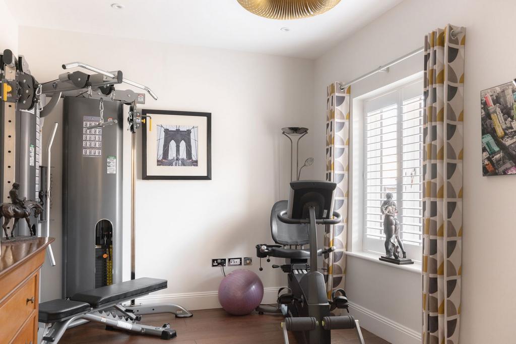 The sitting room is a refined space, with beautiful views to the rear and a wood-burning stove, creating a warm and inviting atmosphere. French doors lead directly into the garden, blurring the boundaries between indoor and outdoor living. The ground floor also features a spacious study and a versatile family room, currently configured as a gym. Underfloor heating beneath solid oak flooring ensures comfort throughout.
