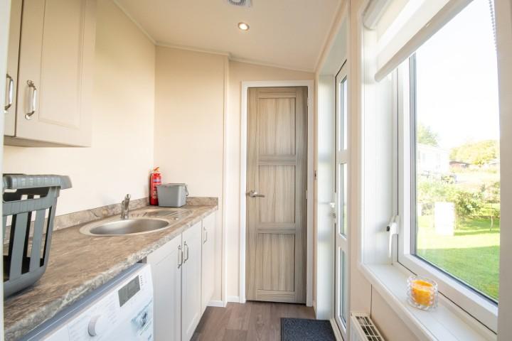 Upvc part glazed side external entrance door, upvc double glazed window, base units space for washing machine, sink with mixer taps, cupboard housing boiler, and radiator.