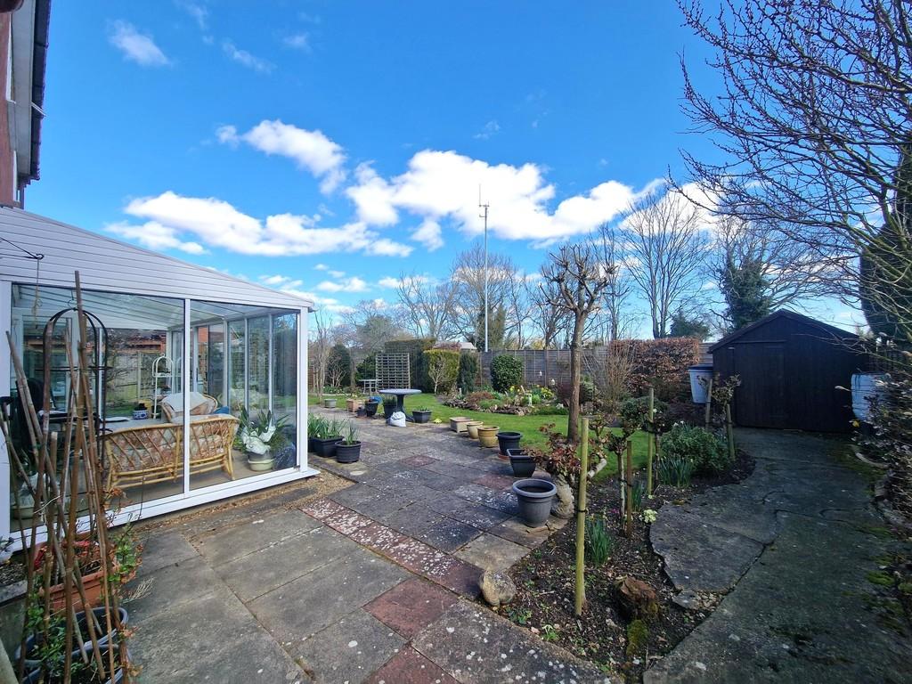 This property benefits from a driveway that provides parking space for two to three vehicles, leading to a double garage equipped with both light and power. The front entrance is accessed via a pathway, bordered by a garden of small shrubs and plants, while a side gate provides access to the rear garden, which boasts a well-maintained lawn, mature trees, and shrubs. The spacious paved patio is perfect for outdoor dining and entertaining. The garden is fully enclosed, offering privacy, with picturesque field views to the rear.
