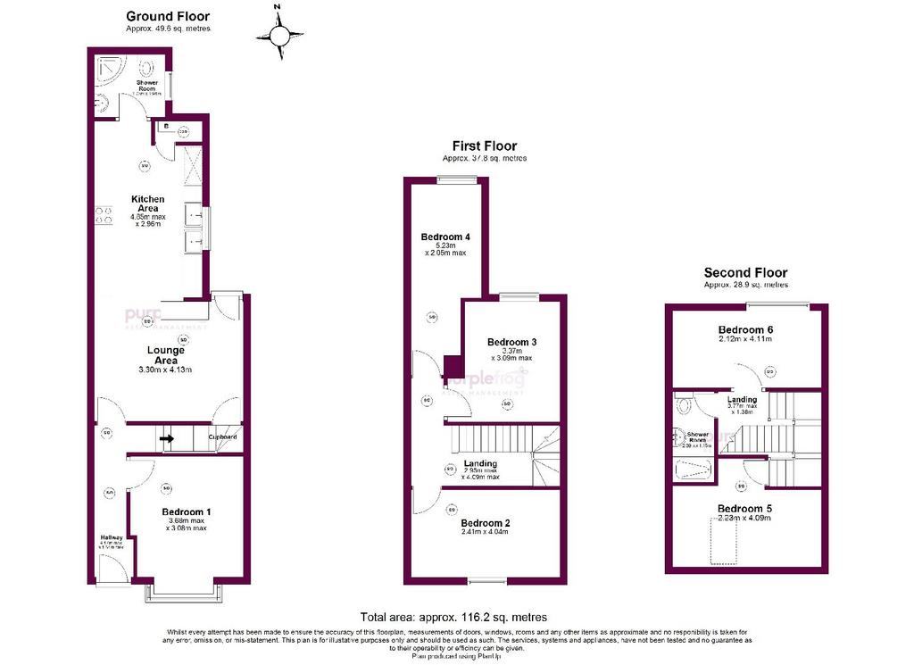 6 large double bedrooms over 3 floors, 2 bathrooms one on the ground floor and one on the second floor.