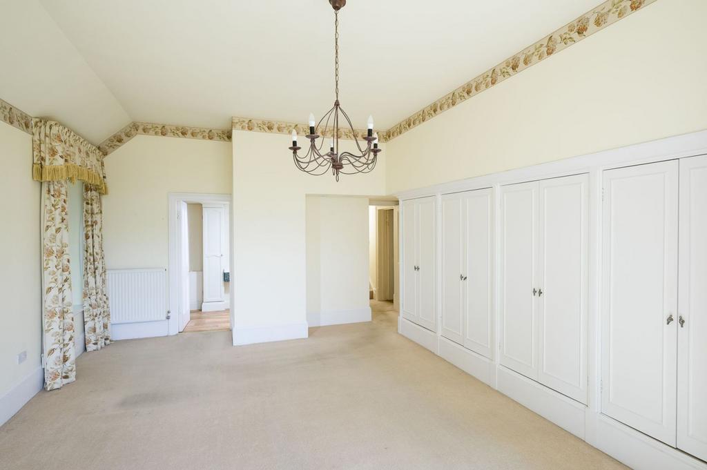 The fitted kitchen, equipped with integral appliances, has views into the garden and beyond. The beautiful master bedroom suite impresses with its high ceilings and a large bay window that floods the room with natural light and views to the horizon.