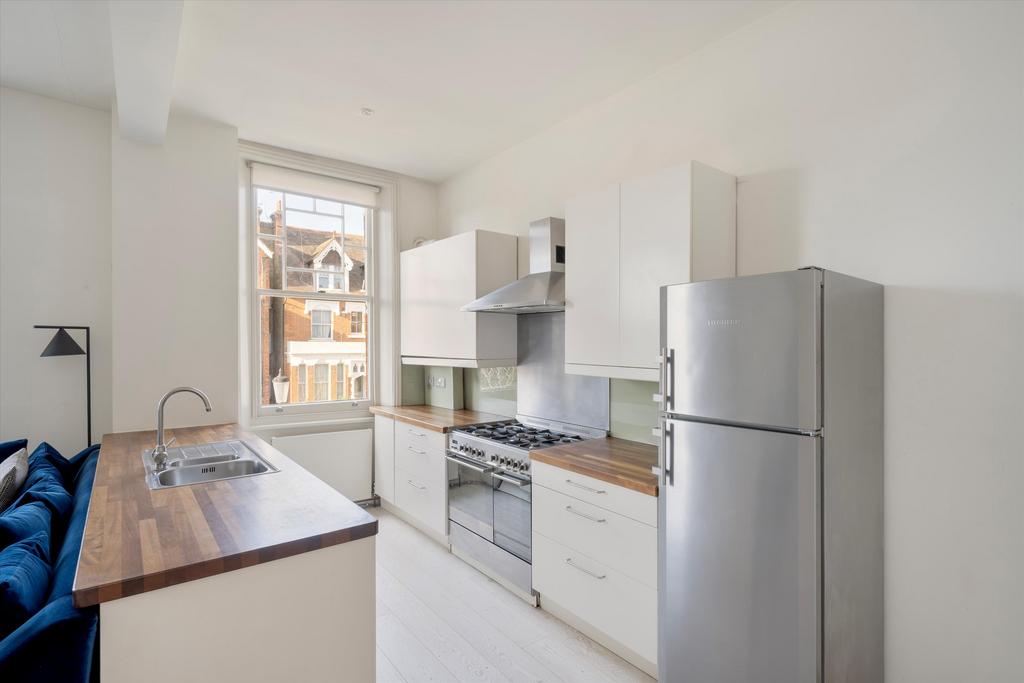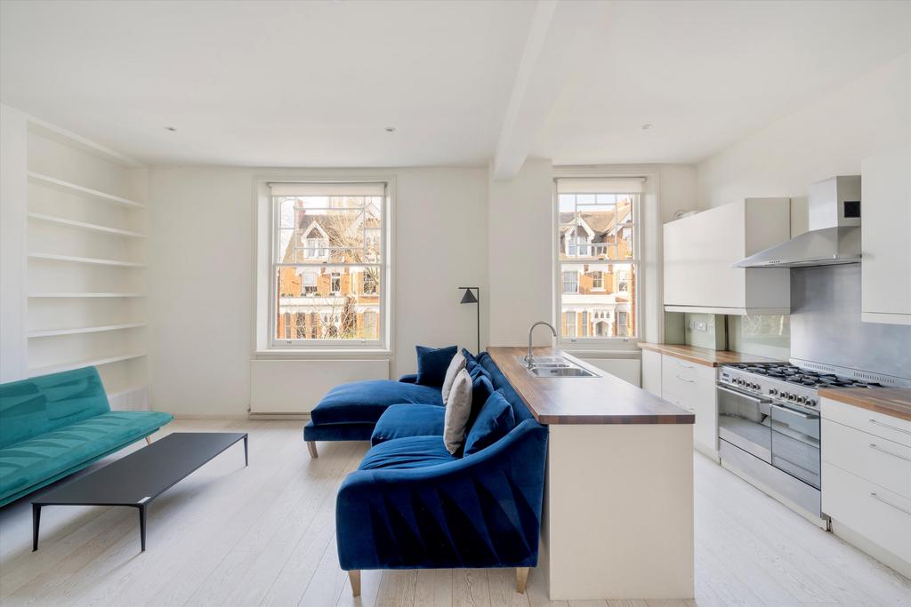 The flat boasts a generous open-plan kitchen and reception area, offering an expansive space perfect for entertaining. The room is bathed in natural light, courtesy of two large windows that enhance the sense of space. Along one wall, you'll find built-in storage, providing both functionality and style. The high ceilings further add to the airy, light-filled atmosphere.