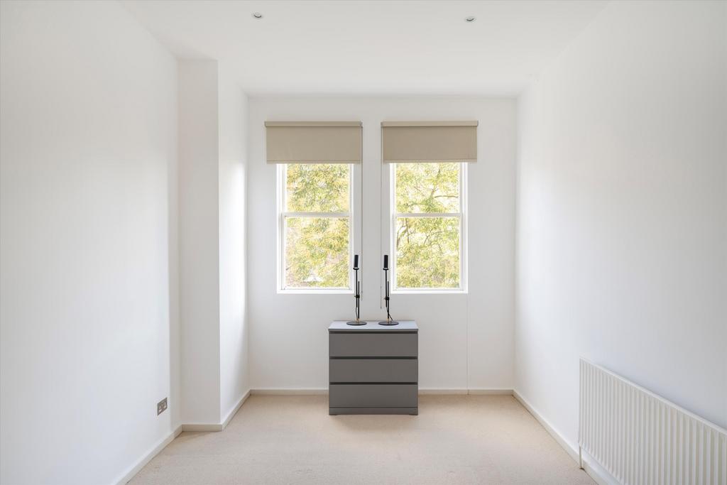 The principal bedroom features a spacious walk-in cupboard, offering ample storage. Both bedrooms enjoy a sunny southern aspect, overlooking the tranquil communal garden to which the flat has access, creating a peaceful retreat.