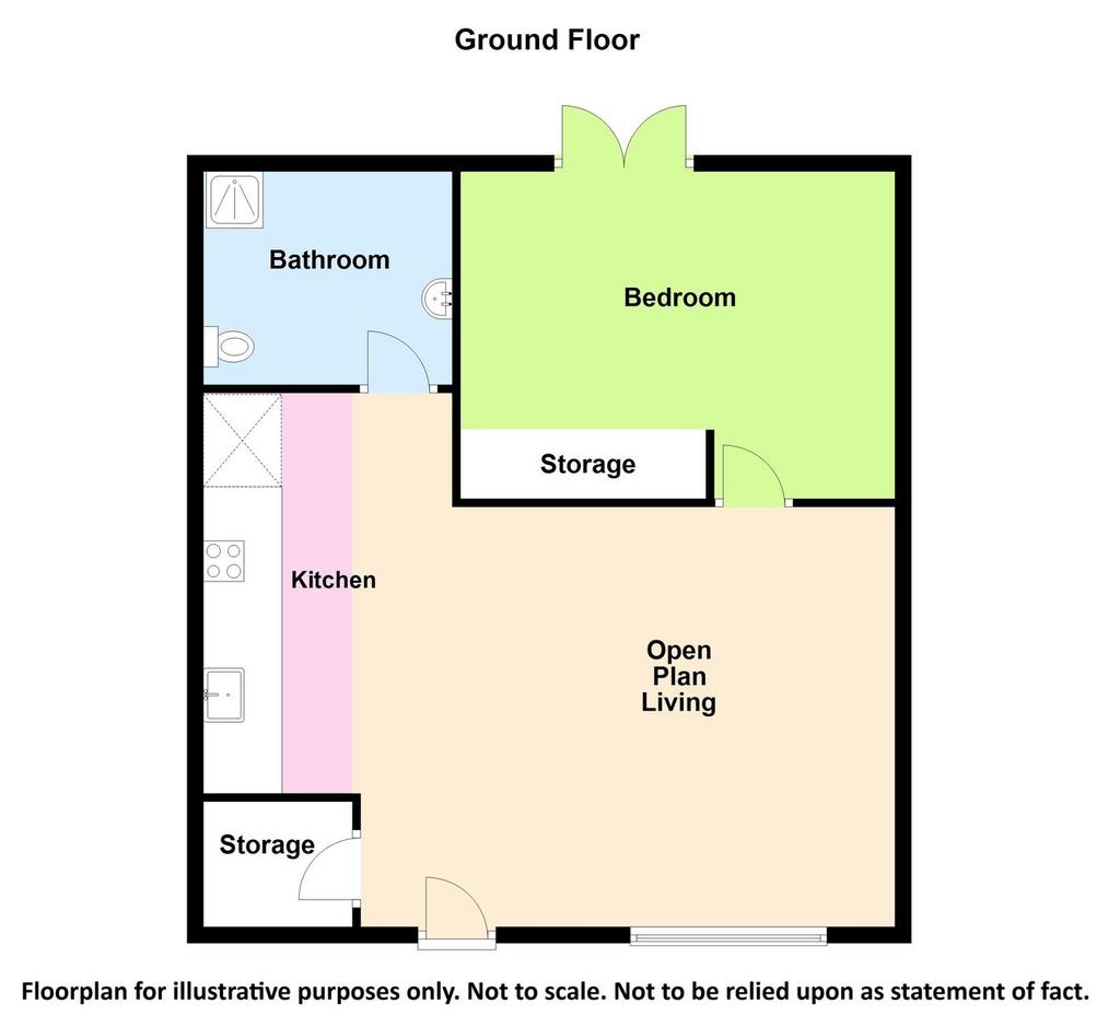 This ground floor flat comprises an open plan living room and kitchen leading onto the bathroom and separate bedroom. The bedroom has patio doors which lead outside and benefits from an allocated parking spot.