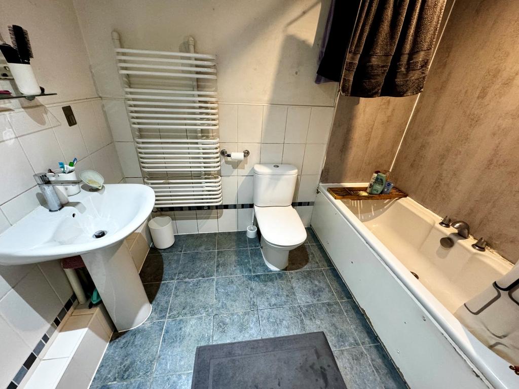 Equipped with a white three piece suite with chrome furniture including low level WC, pedestal hand basin and panelled bath over which there is a curtain and shower facility.