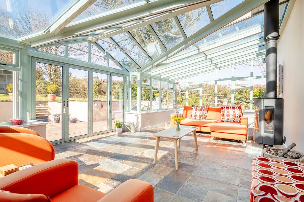 Stepping into the main family lounge, you'll be embraced by a warm atmosphere, highlighted by a lovely wood burner and beautiful wooden flooring. This inviting room boasts stunning views over the garden and beyond, extending toward the Severn Bridge, creating a picturesque backdrop for everyday life. French doors open out to the grounds, allowing you to fully enjoy the serene surroundings - it's the ideal space for relaxation and appreciating nature.