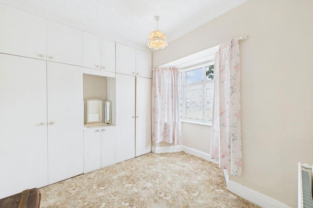 Bay window, built-in cupboards with shelving and cupboards above, radiator X2.