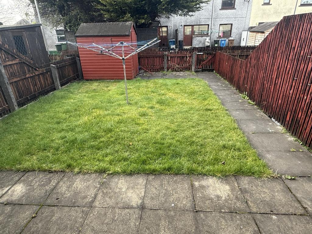 Fully enclosed with garden shed. Laid to grass with paved path.