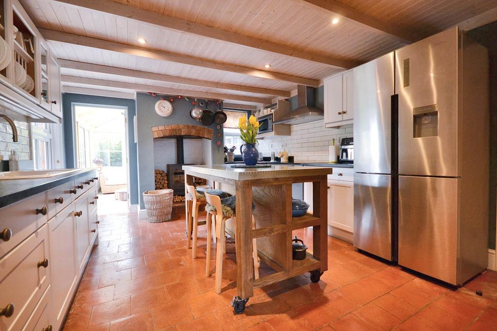 The kitchen enjoys a wealth of units which sit alongside a host of integrated appliances, and which also features a log burning stove, sitting inset to the chimney breast. A door from the kitchen leads through to a large, separate utility room which in turn provides access to the plant room and walk in pantry. To the head of the kitchen, an opening leads through to the conservatory which allows one to enjoy super views over the properties mature garden.