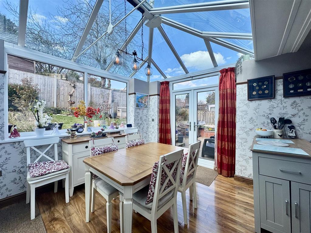 Dining Room - 3.53 apx x 3.37 apx (11'6" apx x 11'0" apx) - Flooded with natural light this amazing addition to the home is a great space to entertain and has uninterrupted views over the garden. Currently used by the vendor as a dining room, there is laminate flooring underfoot, patio doors open to the garden, a door leads through to the office and an opening leads through to the kitchen.