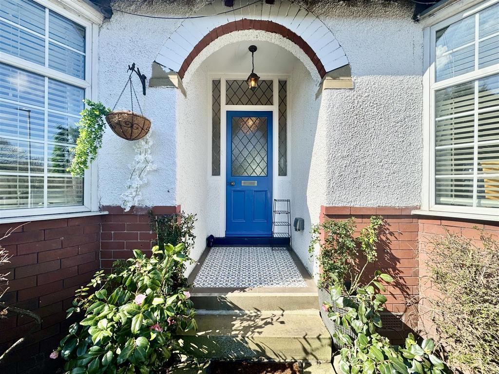 External Front - Stone steps ascend from the roadside to the lawned garden which has flowerbed borders and space for decorative pots and planters. An Indian Sandstone pathway leads down the side to the rear garden and a pathway leads to the front door.