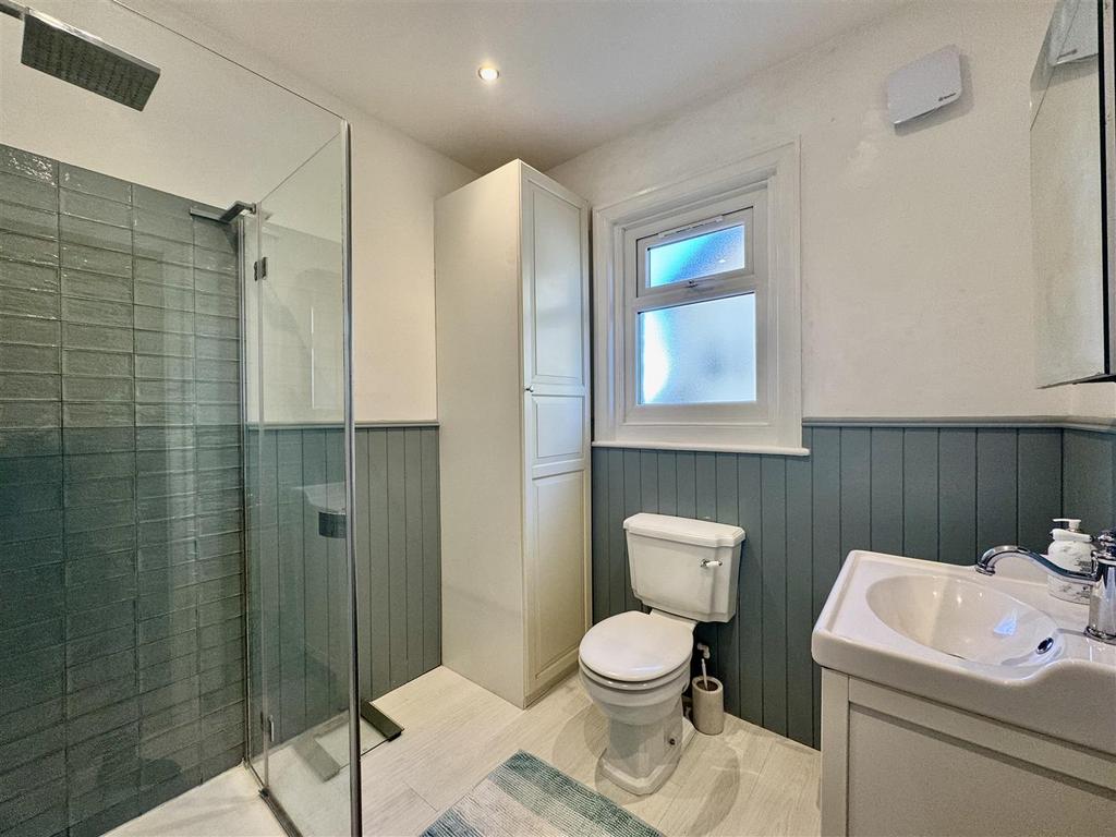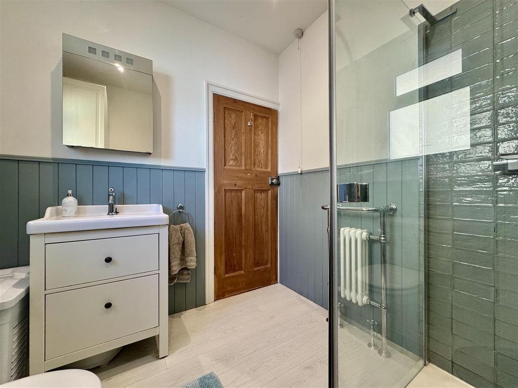Shower Room - 2.28 apx x 2.27 apx (7'5" apx x 7'5" apx) - This attractive shower room is fitted with a three-piece white suite, including a waterfall shower with glass screen, vanity hand wash basin with mixer tap, a low level W.C and a heated towel rail. The room is partially tiled with complimentary laminate flooring underfoot, ceiling with spotlights, a side obscure window allows light to flow through and a door leads to the landing.