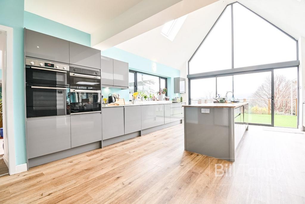 approached via a contemporary double glazed double doors and having an electric sky lantern, wide picture window framing the glorious view to the rear and storage cupboards.