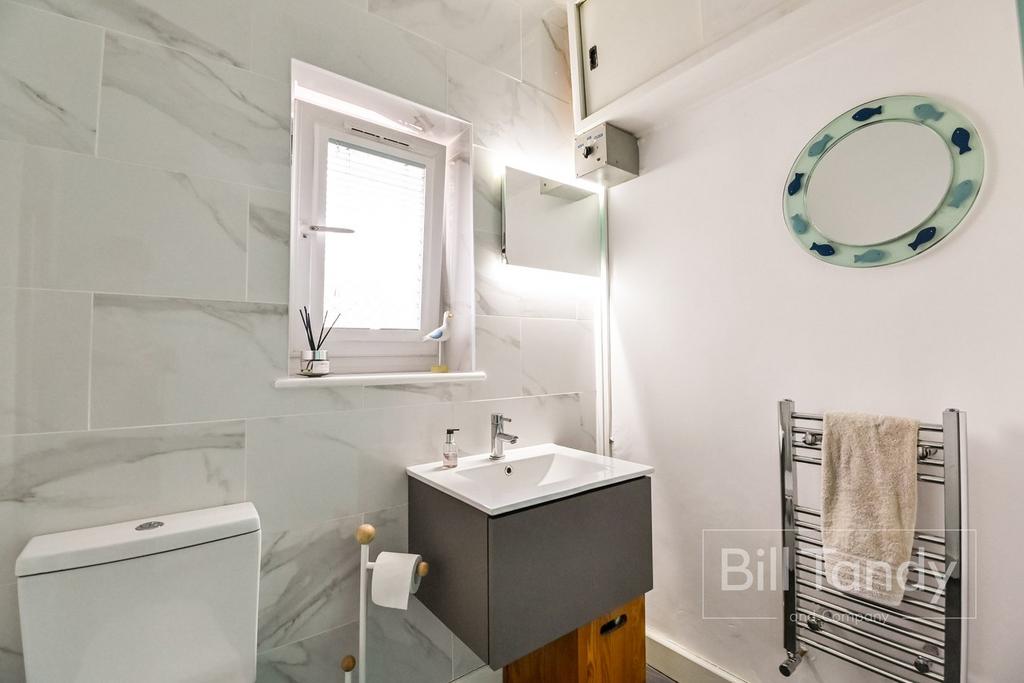 having close coupled W.C., vanity unit with wash hand basin, LED mirror, co-ordinated tiling and chrome heated towel rail.