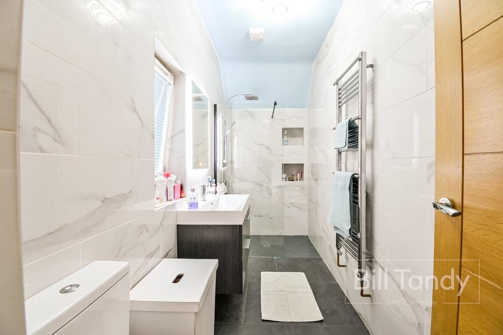 again fully tiled with large shower area with thermostatic shower with hose and drencher shower, vanity unit with wash hand basin and drawer space beneath, close coupled W.C., LED mirror and chrome heated towel rail.