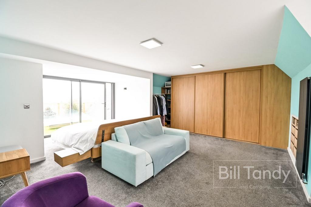 5.37m x 5.22m (17' 7" x 17' 2") a truly versatile room having a high ceiling, full height glazed panel and a range of fitted furniture which can double as wardrobes or storage.