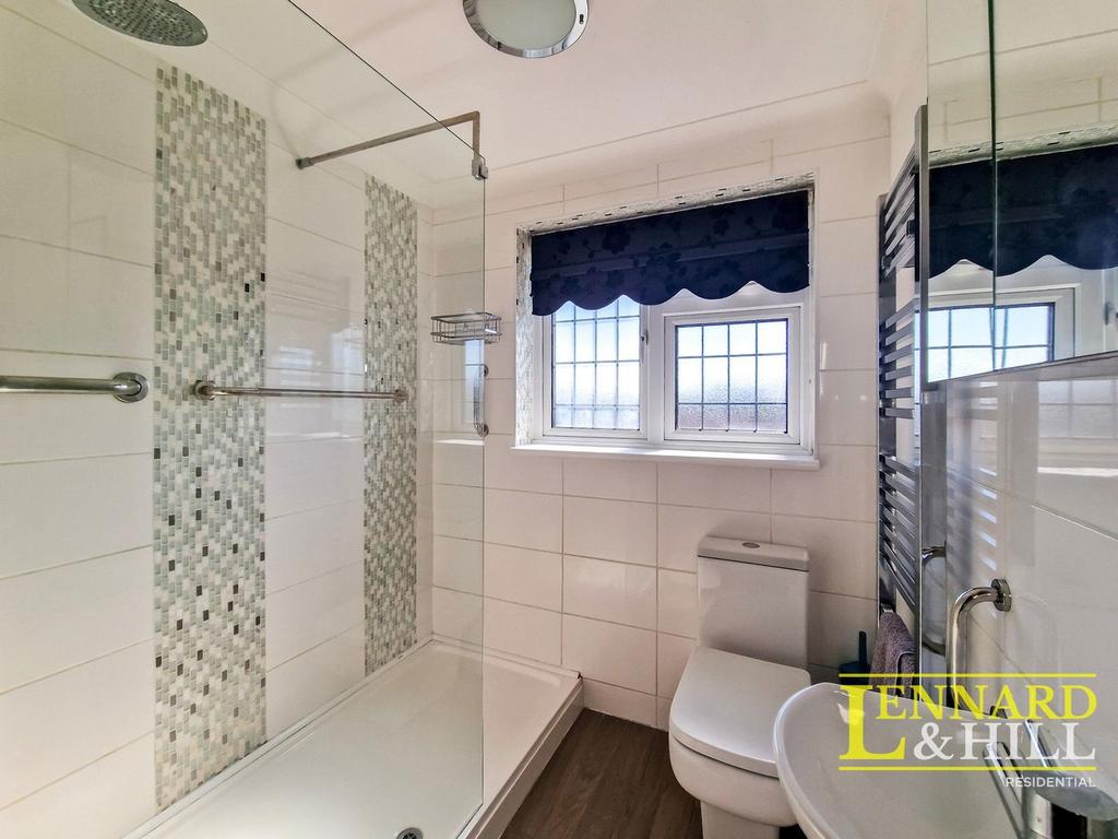 Opaque double glazed window to rear. Ceramic tiled floor and ceramic tiled walls with a proud mosaic panel. Modern white suite comprising vanity unit with wash basin, close coupled WC and walk-in shower enclosure with overhead rose. Chrome ladder radiator.