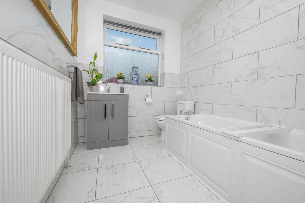Window to rear, radiator, panel bath, pedestal wash hand basin, close coupled WC, half tiled walls.