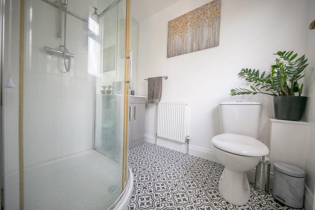 Window to rear, shower cubicle, pedestal wash hand basin, close coupled WC, radiator, tiled splashbacks.