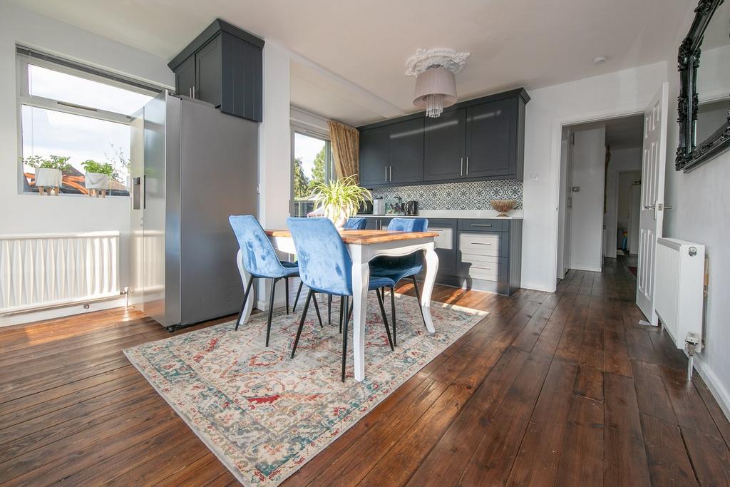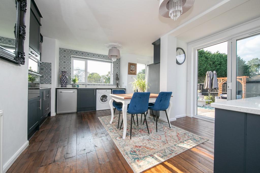 17' 0" x 13' 5" (5.18m x 4.09m) Windows to side and rear, patio doors to rear, door to side, radiator, a range of fitted units and drawers with worktops, fitted oven and hob, inset sink, matching eye level units, tiled splashbacks, spaces for appliances.