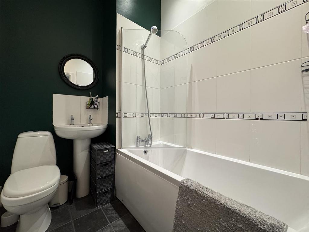 House Bathroom - 1.65 apx x 2.16 apx max (5'4" apx x 7'1" apx max) - Fitted with a three piece white suite comprising a bath with shower over and glazed screen, pedestal hand wash basin and low level W.C. Stylish wall tiles adorn the walls, there are spotlights to the ceiling, vinyl flooring and a chrome heated towel rail. A door leads to the landing.