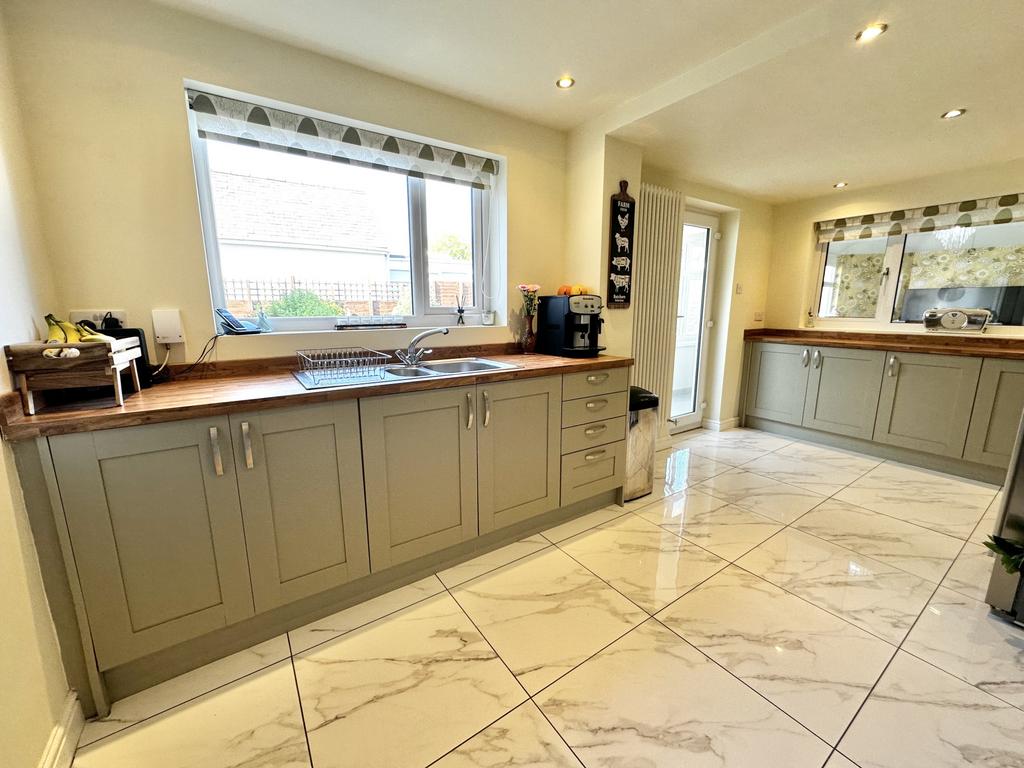 UPVC double glazed window to the side aspect. Modern fitted kitchen with a range of wall and base units with complementary work surfaces, space for Range style cooker and American fridge freezer, sink with mixer tap, tiled floor and radiator.