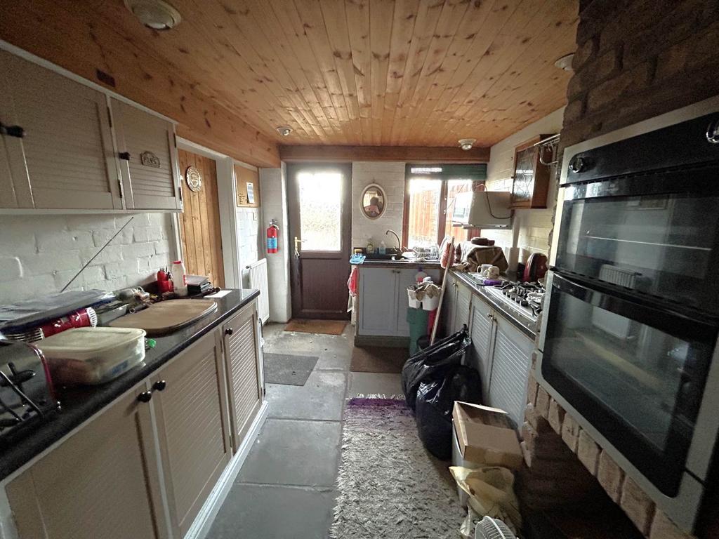 Range of wall and base units, integrated double oven, five ring gas hob, one and a half bowl composite sink unit with mixer tap, spotlights to ceiling, door leading to utility room and UPVC door leading to rear garden.