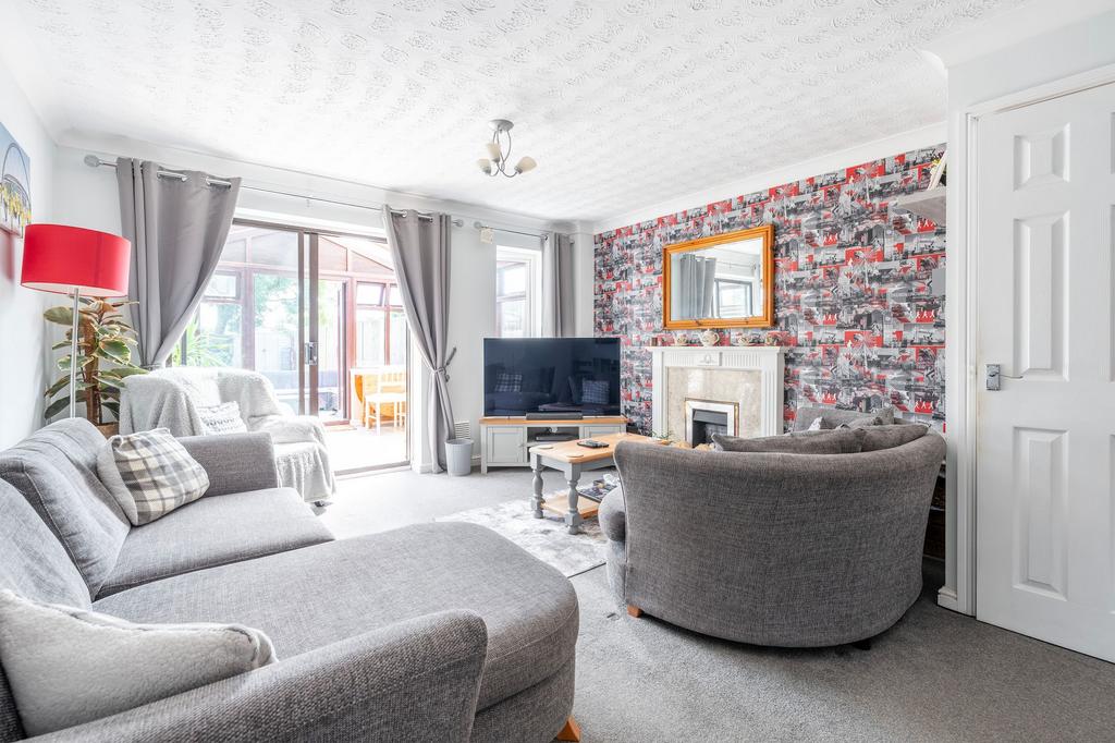Upon entering through an entrance hallway, you are welcomed into a cosy open-plan living and dining area featuring a fireplace and plush carpet floors, creating a warm ambience. The lounge extends graciously to a sunlit conservatory through sliding doors, offering a peaceful space flooded with natural light through its windows all around. The well-appointed kitchen is equipped with built-in cabinets and under-counter space for a washing machine or a dishwasher, catering to all your culinary needs. A convenient ground-floor WC adds to the functionality of the house, enhancing overall comfort.
