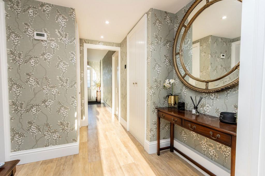 Continuing through the hallway, a convenient utility room with a WC enhances practicality for busy households. Beyond, a newly fitted bespoke kitchen impresses with Quartz work tops and high-quality integrated appliances including a fridge, freezer and dishwasher. french doors open onto the rear garden, extending the living space outdoors—ideal for entertaining.