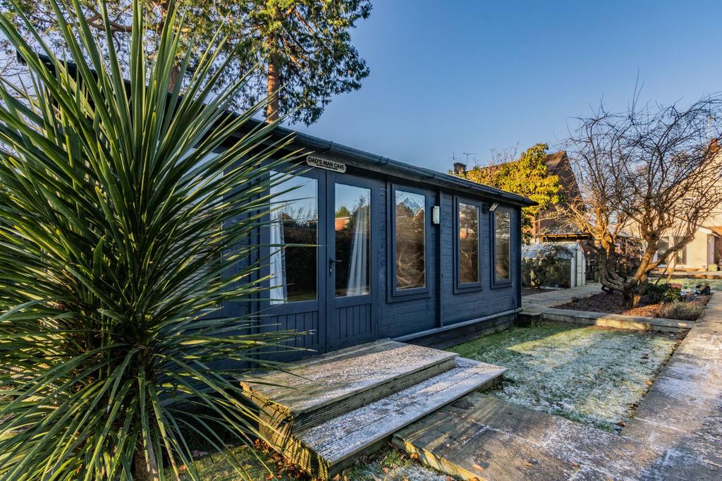 The rear garden stretches approximately 120ft, offering a wonderful space for relaxation and recreation. A brick-built outbuilding and greenhouse provide fantastic storage or workspace opportunities. Towards the end of the garden, a substantial double-skinned cabin with full insulation in the walls, floor, and ceiling presents an excellent home office, studio, or guest retreat.