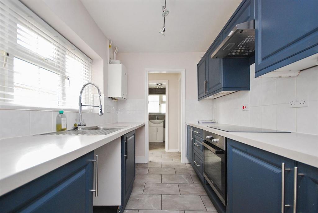 The kitchen is planned with matching range of wall and base units arranged on two walls with inset stainless steel sink unit. Work surfaces. Partially tiled walls. Plumbing for washing machine and dishwasher. 'Worcester' gas boiler. Window to side. Power points. Tiled floor.