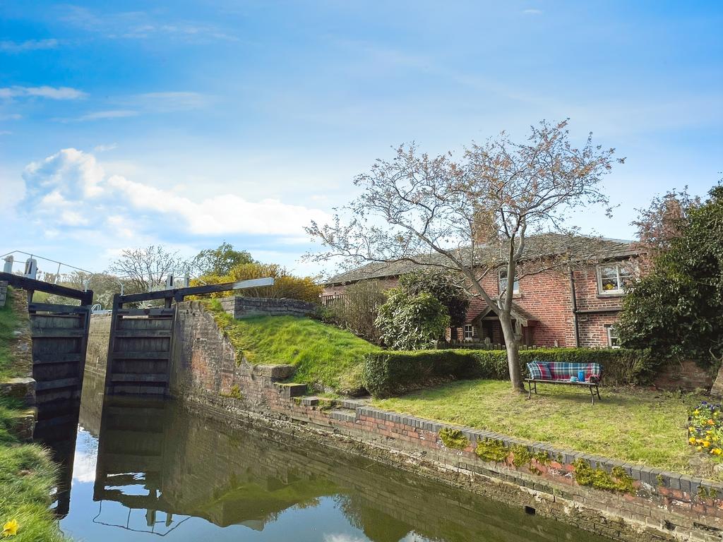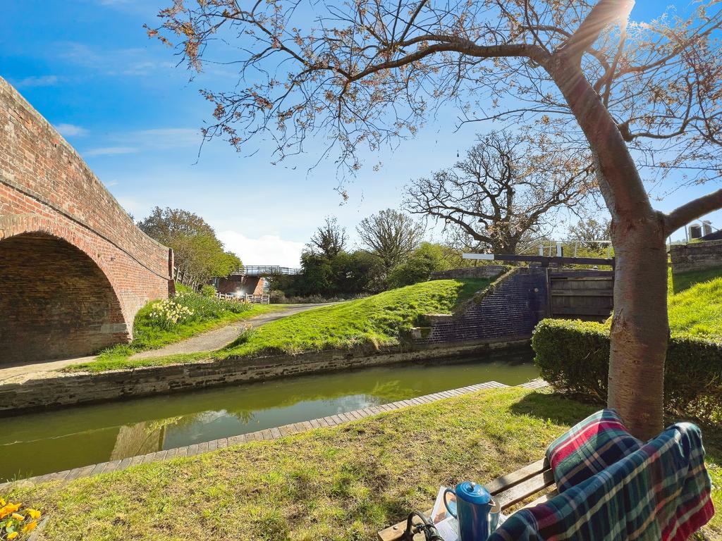 The front garden is laid to lawn, being fully enclosed and approached through wooden gates with gravelled area leading to the garage. There are various seating areas, and mature trees and bushes with two outbuildings and a vegetable patch. The rear garden overlooks the lock and canal offering a tranquil seating area with lawn and box hedging. It is fully enclosed.