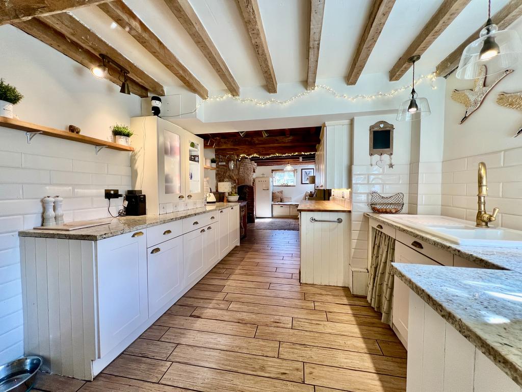 With two windows to the side and one to the rear elevation, having a comprehensive range of base level cupboards and drawers with matching wall cupboards, glazed display cabinet, inset ceramic sink and drainer with high rise mixer tap, exposed brickwork with original bread oven, exposed beams, recess housing range cooker, space and plumbing for dishwasher, space for upright fridge freezer, radiator, box seating area with storage beneath, tiling to walls and tiled flooring.