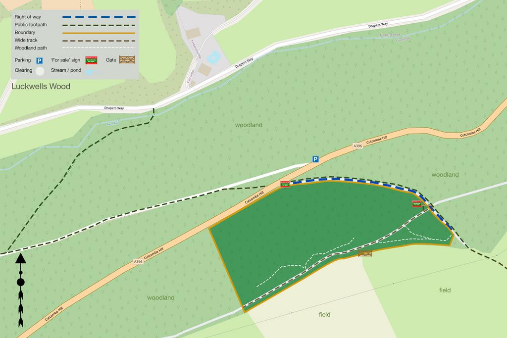 Boundaries: The boundary is fenced to the south and borders open fields. North is open and follows Cutcombe Hill. East and west border neighbouring woodland. W is staked and marked with blue paint, while E follows the main access track.