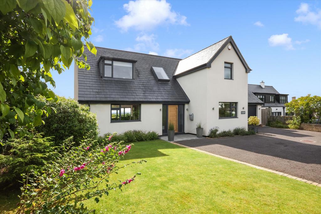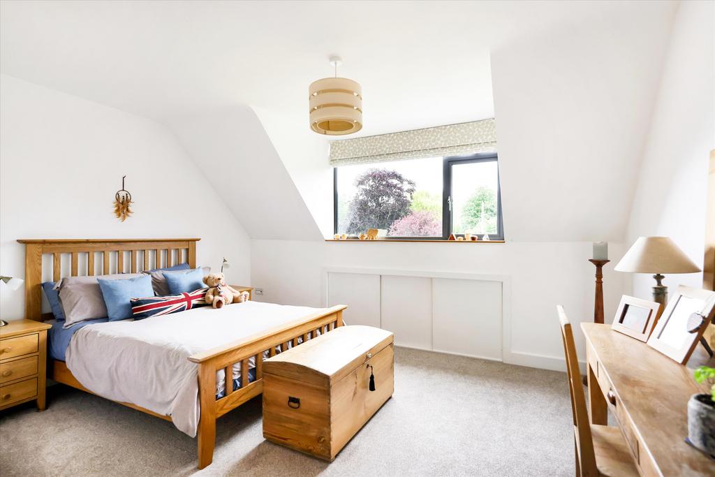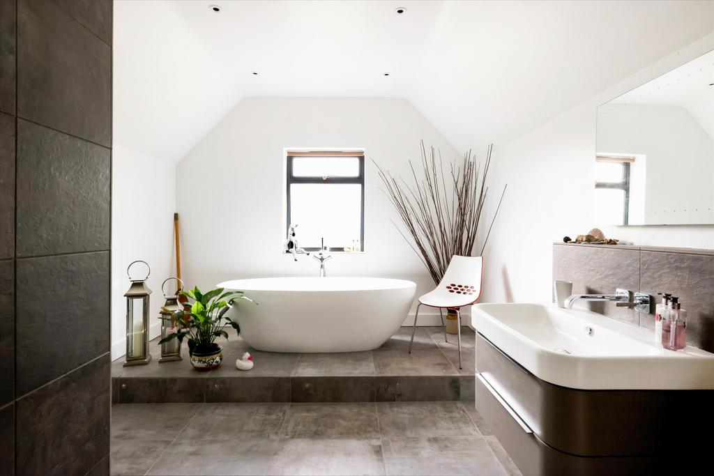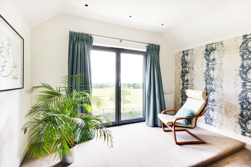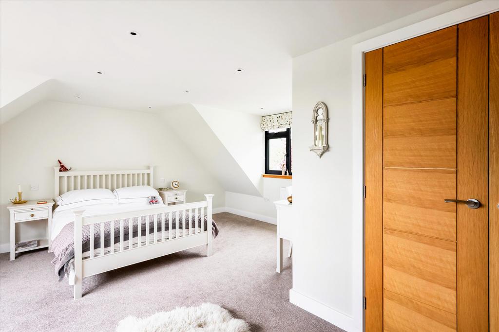 The first-floor bedrooms all enjoy panoramic views. The principal suite features bi-fold doors that open to spectacular views of the garden and countryside. It also includes a walk-in wardrobe/dressing room and an en suite shower room. A guest bedroom mirrors this with similar views and size, along with a fitted wardrobe. At the front of the house, two double bedrooms share a luxury family bathroom with a freestanding bath, all accessed from a spacious landing.