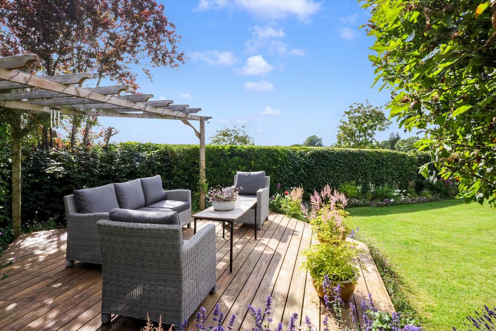 Outside, Langdale enjoys views that would be hard to beat and is surrounded by a beautifully established garden. The grounds are set over two levels, with the house slightly elevated above a well-maintained lawn, bordered by perennials, bushes, and flower beds offering changing seasonal hues. The terrace extends from the main reception room, providing a perfect outdoor seating area, while a corner patio with a pergola captures the stunning views. A large driveway at the front of the house, accessed from a picturesque lane, provides off-road parking for several cars and leads to a spacious garage.