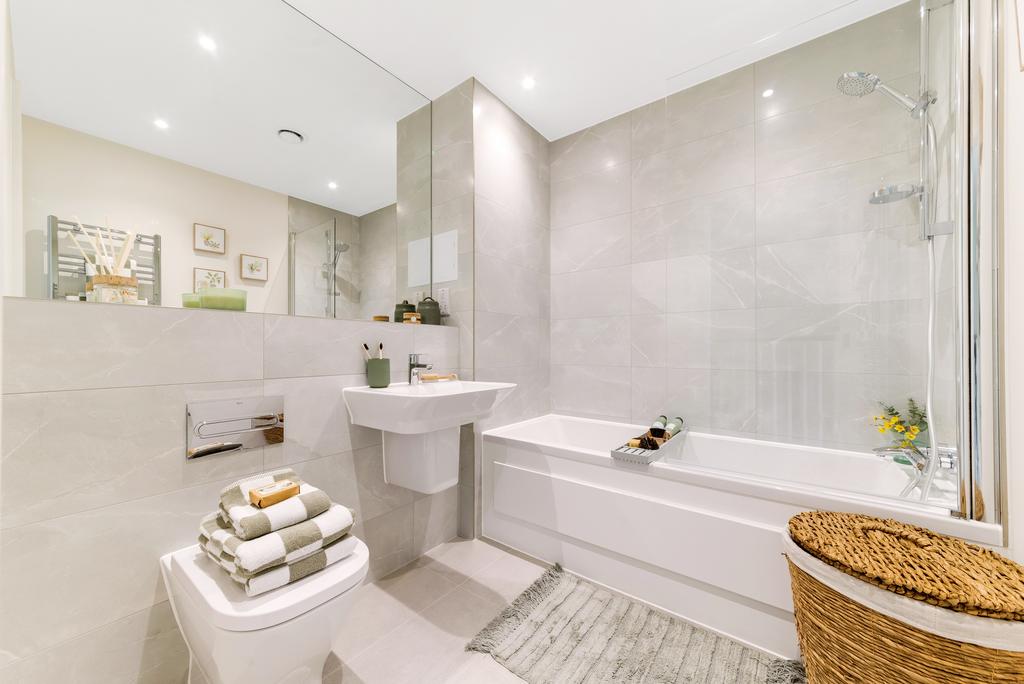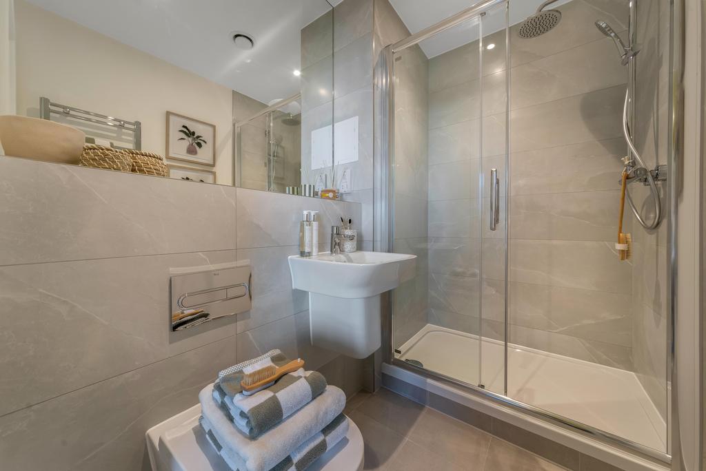 Discover comfort in the double bedrooms, with your own private en-suite or treat yourself to the modern bathroom, featuring light grey porcelain tiles, a white suite with a bath, and an overhead fixture with a glass screen. Enhance the experience with a full height mirror that adds a touch of luxury.