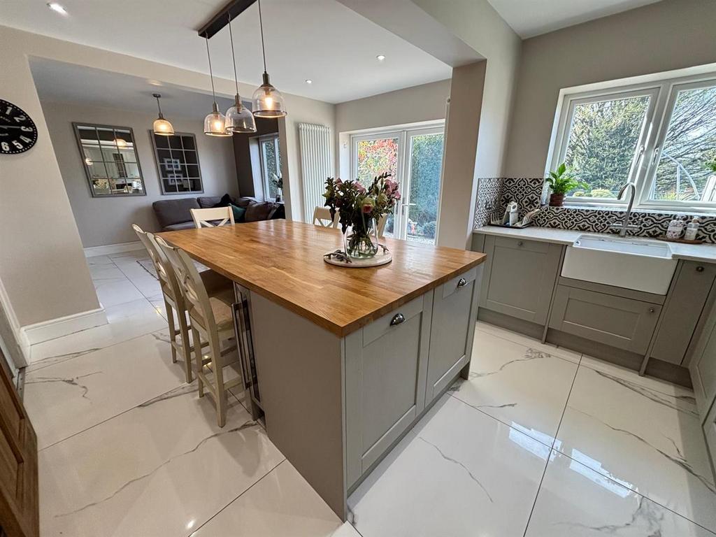Dining Kitchen - 4.60m'' reducing to 2.11m'' x 5.56m'' reducing to - Beautifully appointed kitchen suite with a comprehensive range of base units with Quartz work surfaces over and matching wall mounted cupboards. Belfast style sink unit with mixer tap. Integrated appliances include a fridge/freezer, washing machine and dishwasher all with matching cupboard fronts. Space for a range cooker with extractor hood over. The feature island unit with solid oak work surface is fitted with a large breakfast bar with stool recess. Recessed ceiling spotlights. Tiled floor with underfloor heating. Recessed ceiling spotlights. Two contemporary radiators. Double glazed window and French doors to the rear aspect. Open plan to the family area.