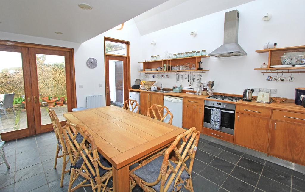 The entrance hall leads to a living room with a fireplace, while, at the heart of the home, is an extended kitchen enhanced by an atrium-style glazed ceiling that floods the space with natural light. Double doors from the kitchen open onto the patio garden so seamlessly connecting indoor and outdoor living. A versatile second reception room provides additional space for entertaining or even a home office.