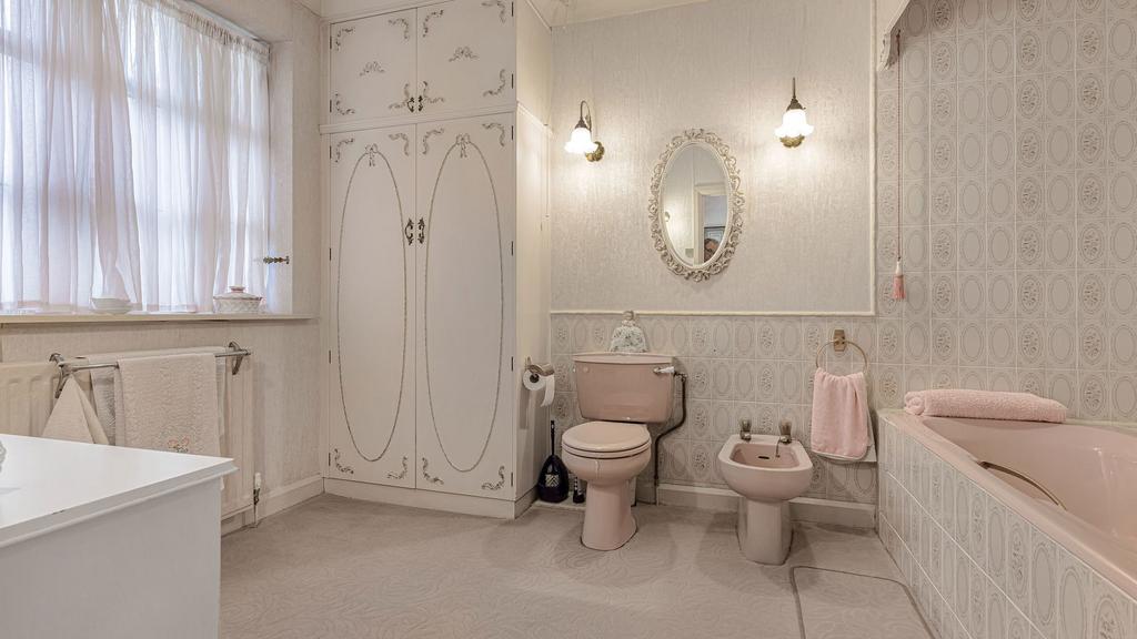 Bathroom/wc with bath, separate shower enclosure to side, bidet and wc. Vanity unit with inset wash basin and double door wardrobe.