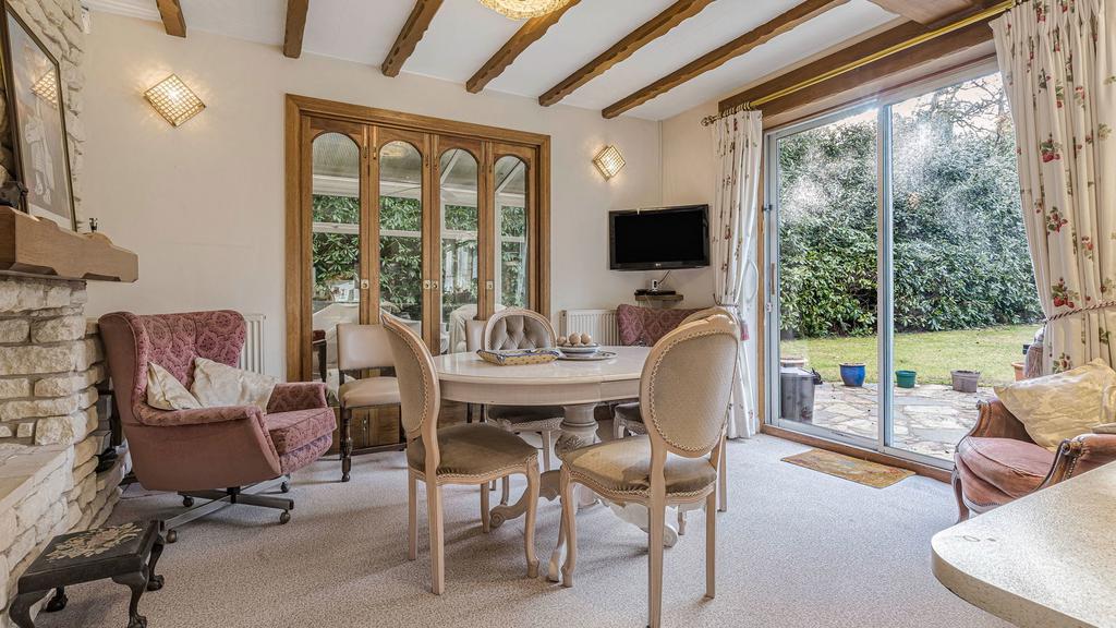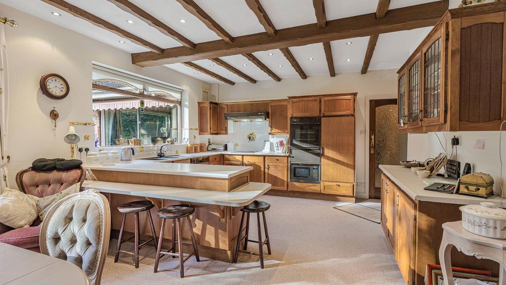 Breakfast/Kitchen with Dining Area. Inset 1 ½ bowl sink, floor cupboards, drawers, worksurfaces, wall units, inset 4 ring hob with extractor hood above, built-in oven with microwave below, and fridge to the side. Built in dishwasher, peninsula unit, glass fronted display unit and picture window overlooking the rear gardens. Feature stone fireplace and chimney breast, timbered ceiling, patio doors to the gardens and folding doors to: