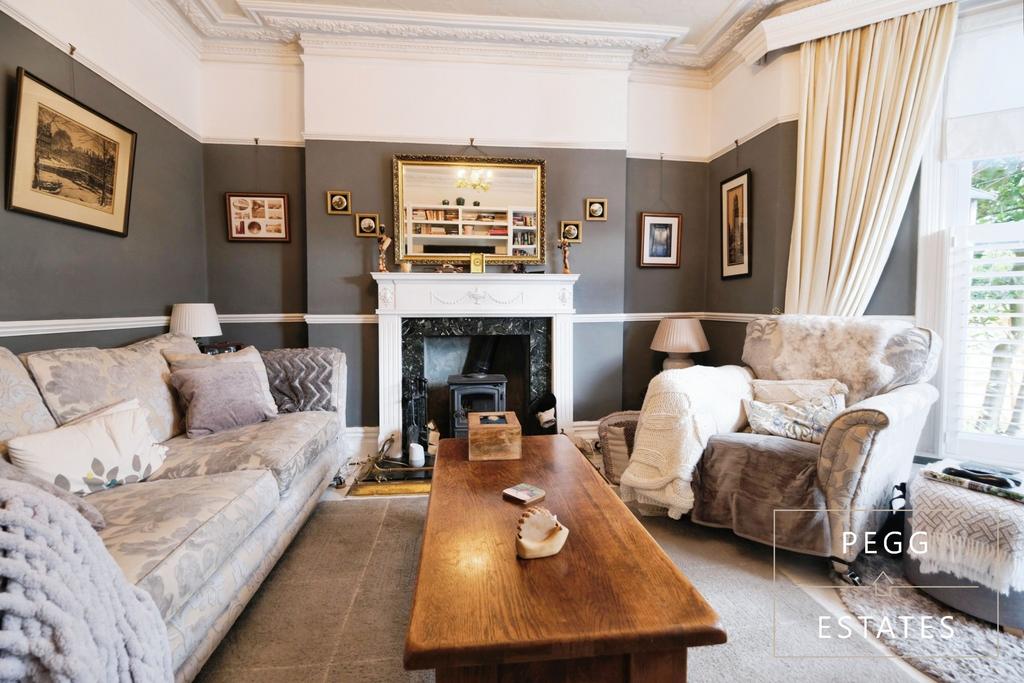 High ceilings and original coving, original door, multi fuel burner with wood surround, double glazed ceiling to floor sash windows roughly two years old, built in cupboards and shelving to sides, radiator to side with cover over, electric points.