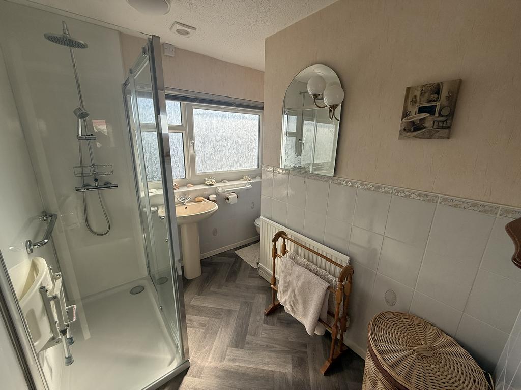 Glazed and tiled shower cubical, pedestal wash and basin, low level flush WC, radiator and double glazed window to front.
