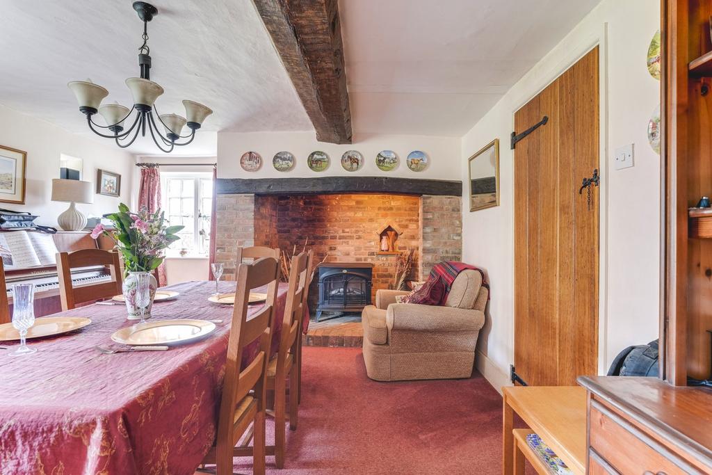 As you step through the front door, you are welcomed into a reception hall that sets the tone for the rest of the home. The captivating living room is the heart of the home, featuring a striking inglenook fireplace that adds both warmth and character to the space. The formal dining room, with its charming dual-aspect windows, provides a bright and airy setting for entertaining, with a further inglenook fireplace. The kitchen, complete with an Aga and a spacious pantry, offers both functionality and charm, with a door leading to the grounds and an additional passage through to the hallway and main staircase. A cozy family room and a quiet study offer the perfect spaces to unwind or work from home, with a second staircase which leads directly to the first floor. Completing the ground floor is a convenient downstairs cloakroom.