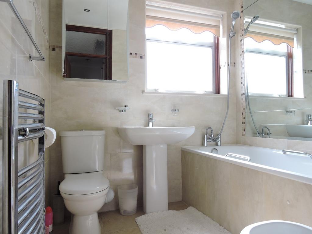 In Our Opinion nicely fitted modern suite comprising bide with mixer taps, pedestal wash basin with mixer taps, low flush wc, tiled panelled bath with mixer taps & shower attachments, fully tiled walls & flooring to neural colour scheme, spot lighting, heated towel rails and double glazed window to rear aspect.