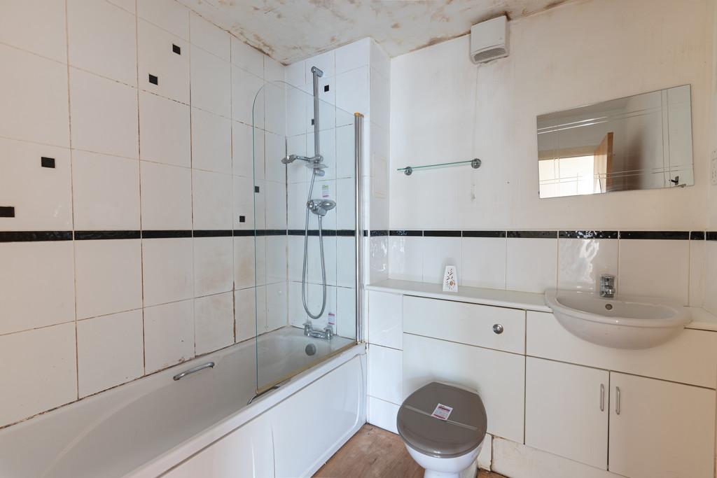 BATHROOM The bathroom is of a good size and features a white three-piece suite with a shower over the bath and a glass shower screen. Integrated vanity units offer practical storage, and there is a wall-mounted mirror and shelf above the sink. The room would benefit from refurbishment, including ceiling repairs and retiling, but presents a blank canvas for upgrading to a modern standard.