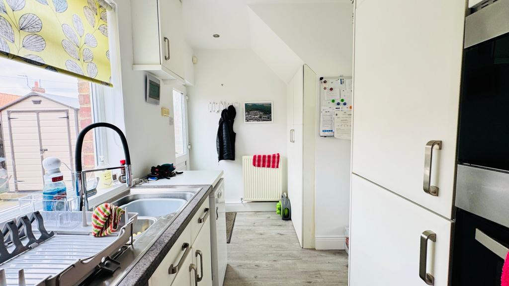 having a range of wall and base units with electric hob, electric oven, sink unit, extractor, double glazed window and door to the rear.