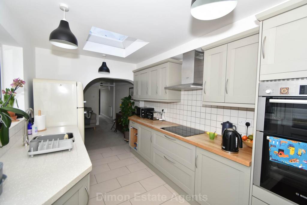 11/2 Bowl sink unit, wall and base cupboards with worksurface over, built in double oven and grill, induction hob with extractor canopy above, tiled splashbacks, ceramic tiled floor, integrated dishwasher, space for fridge, PVCu double glazed window and door to garden, skylight roof.