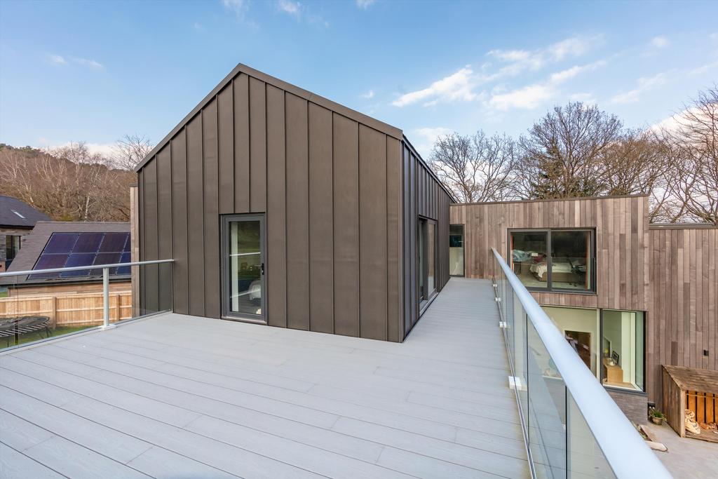 The landscaped grounds include lawns, paved seating areas, steps, and planted beds, all surrounded by hedging and mature trees. Automated gates provide access to the property, offering privacy and security.