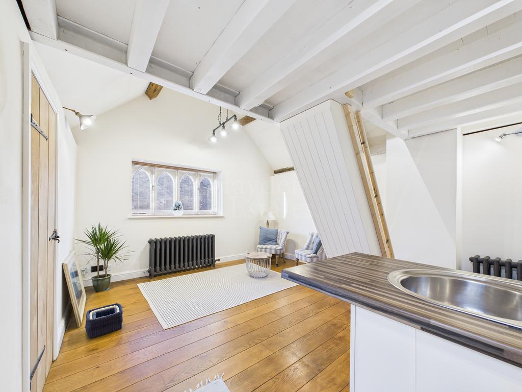 Oak flooring, recessed cupboard housing meters. Aerial point, old style radiator, attractive double glazed wooden window to side elevation, ceiling light point and two wall light points. Paddle stairs rising to the sleeping area.